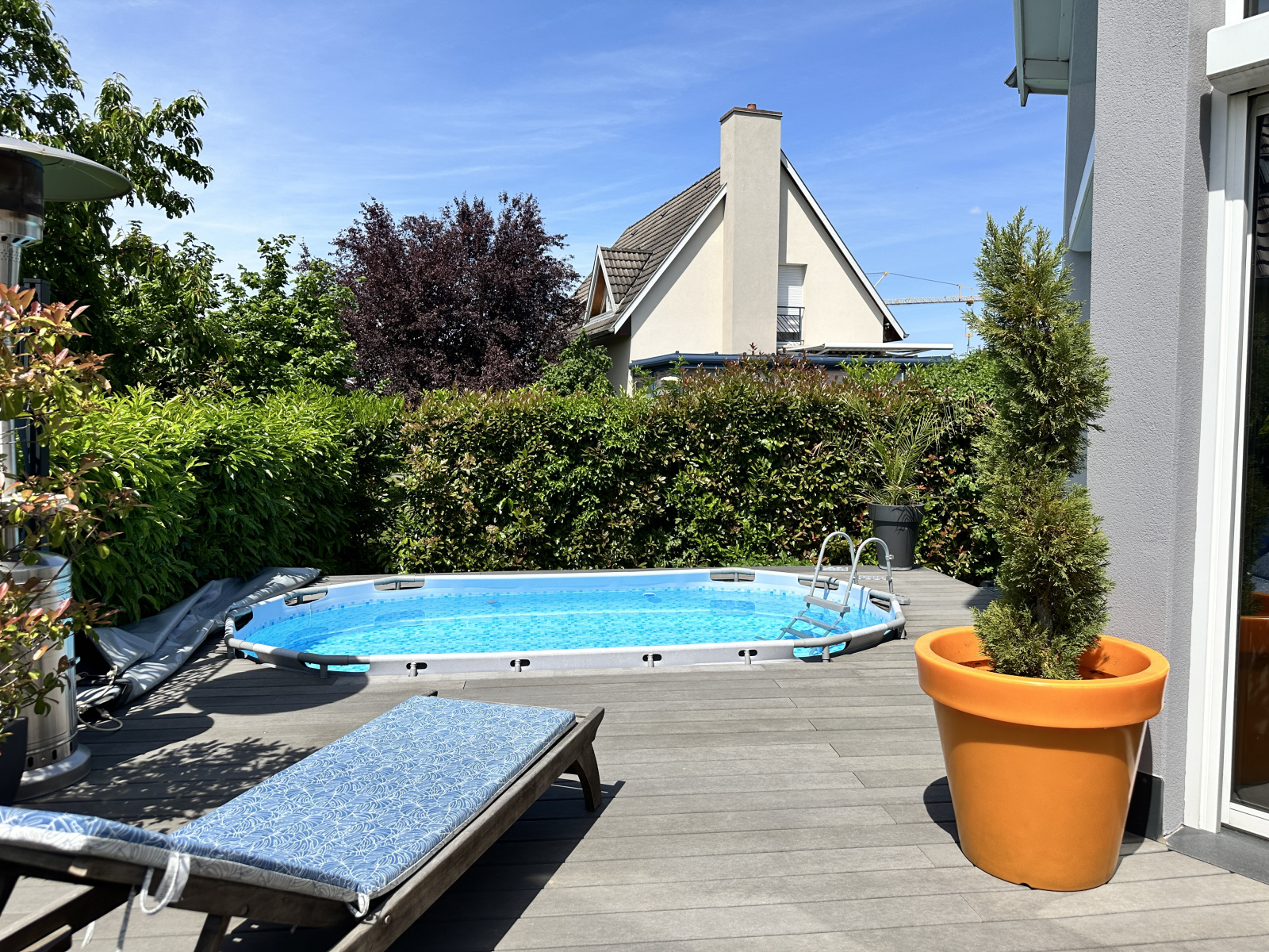 A l'extérieur, sur 5.41 ares de terrain clos et paysagé, vous apprécierez la grande terrasse plein sud ainsi qu'un point d'eau permettant de se rafraichir (piscine autoportée d'une hauteur d'eau de 90 cm).