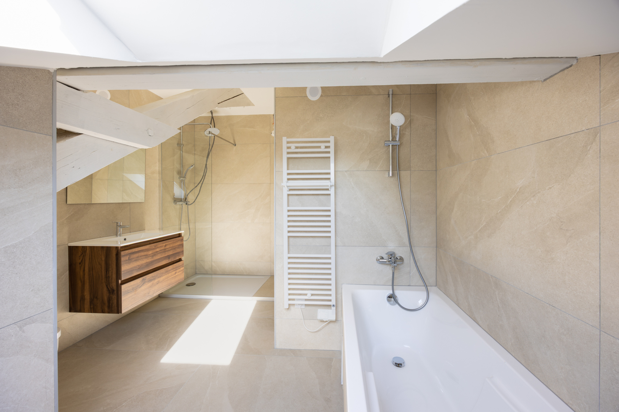 Il comprend un hall d'entrée, une petite salle d'eau avec douche et wc suspendu, un vaste salon salle à manger ouvert sur cuisine équipée d'une surface de 42 m², 3 belles chambres, une salle de bains avec douche baignoire et wc, un espace cellier buanderie.