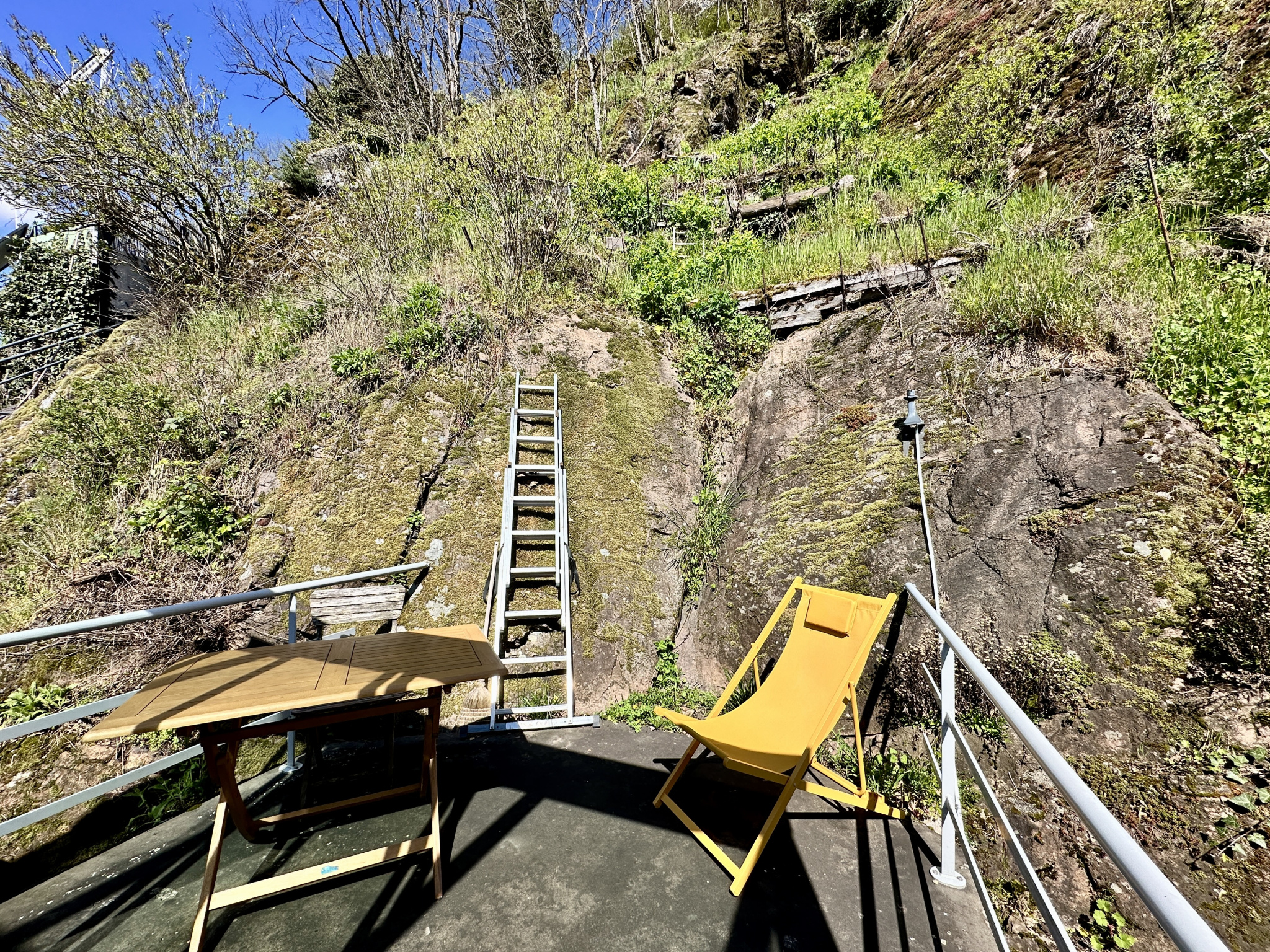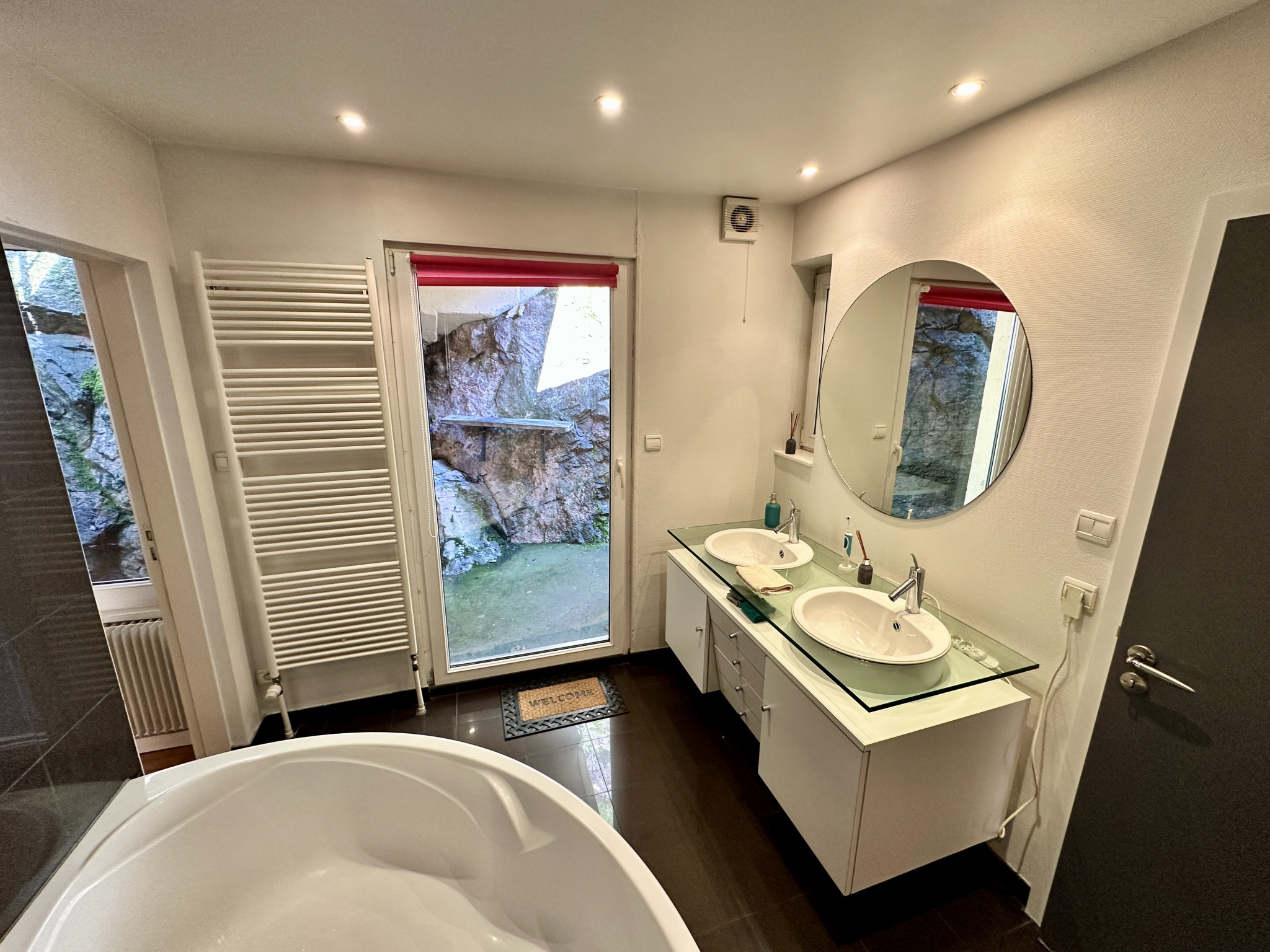 Au premier niveau, un dégagement, un espace salon tv, une chambre, un dressing, un wc séparé, une salle de bains équipée d'une douche et baignoire, qui s'ouvre sur un petit coin extérieur, niché contre la roche (pourquoi ne pas y installer un petit spa ?).