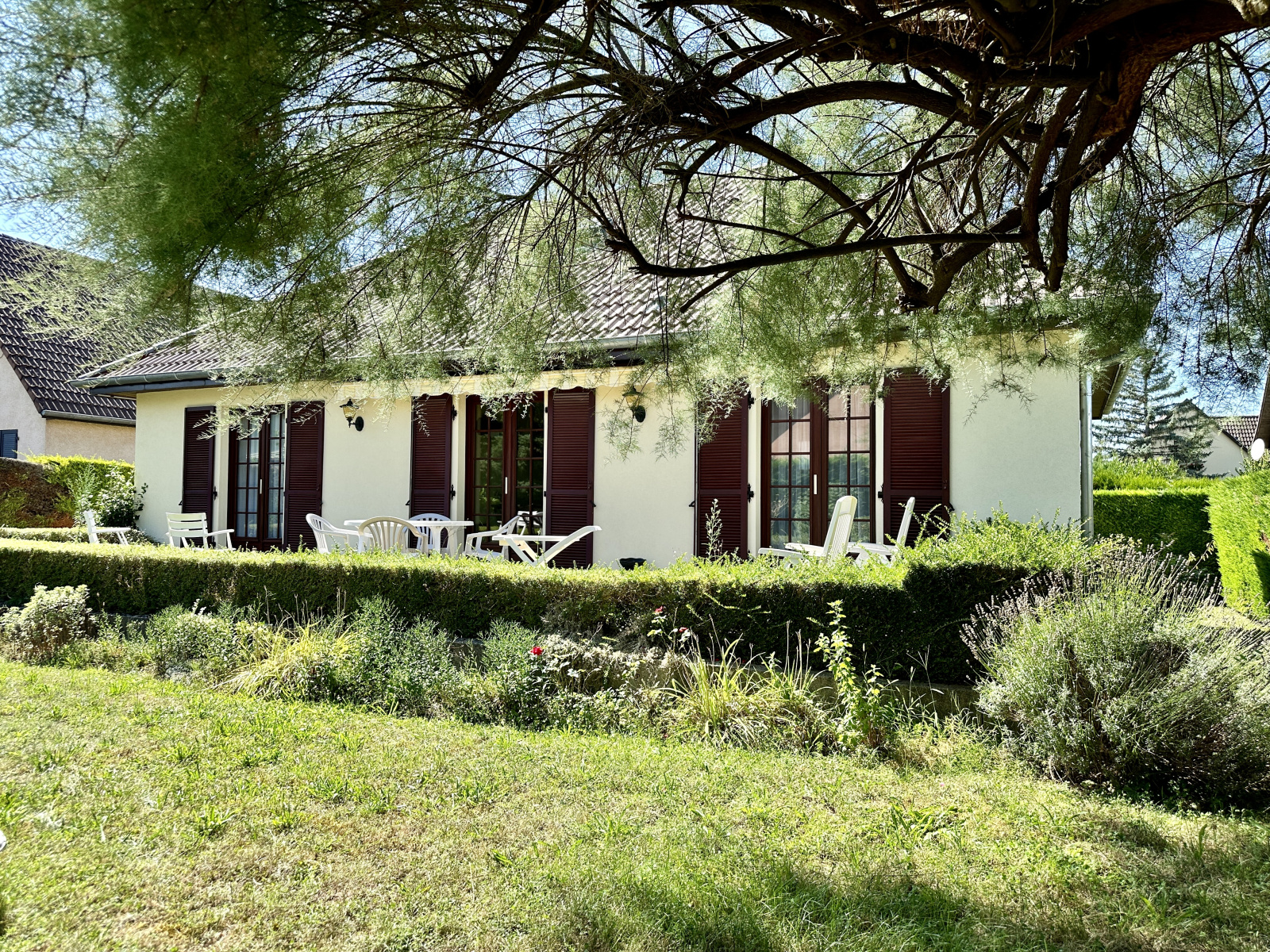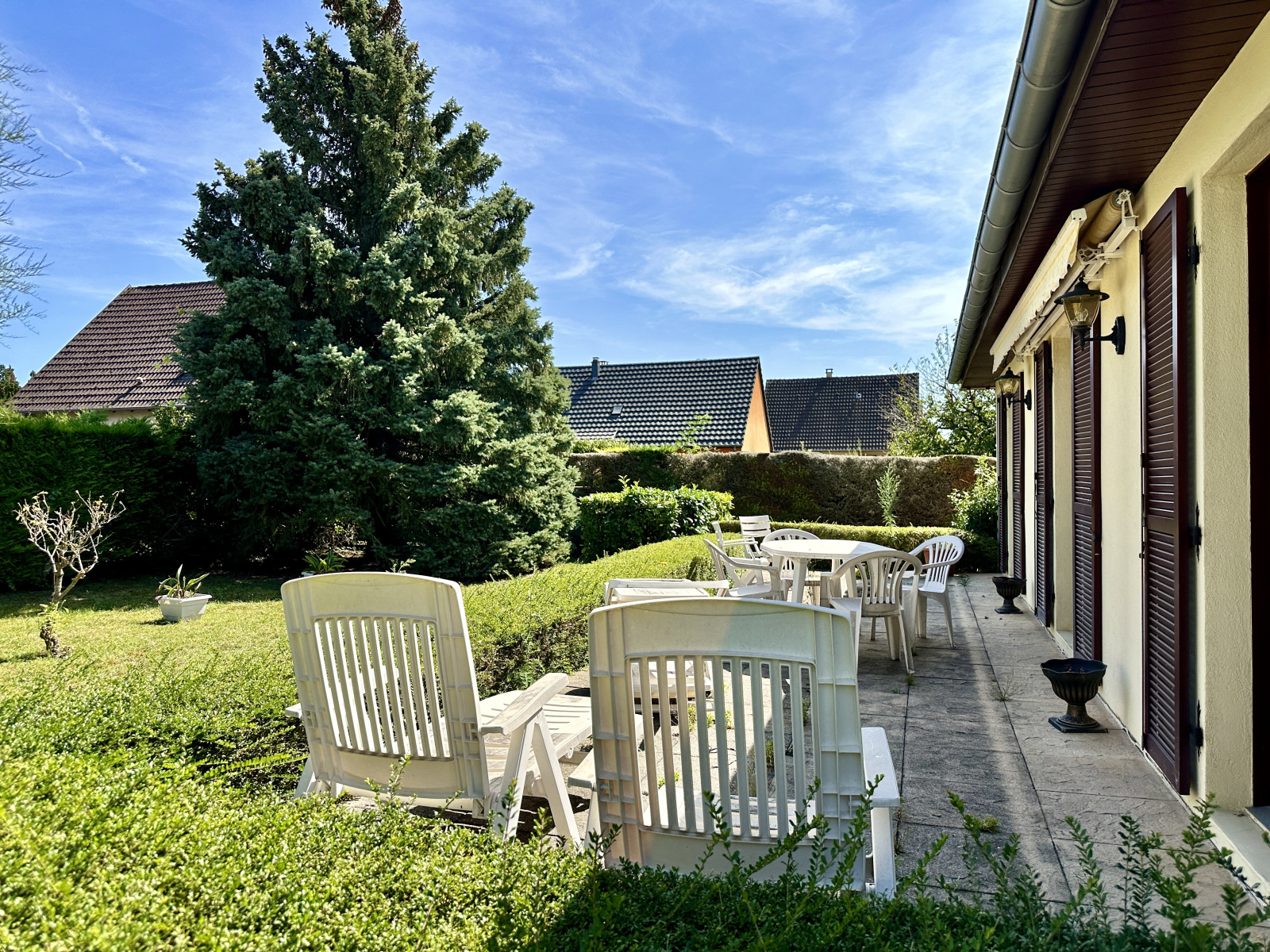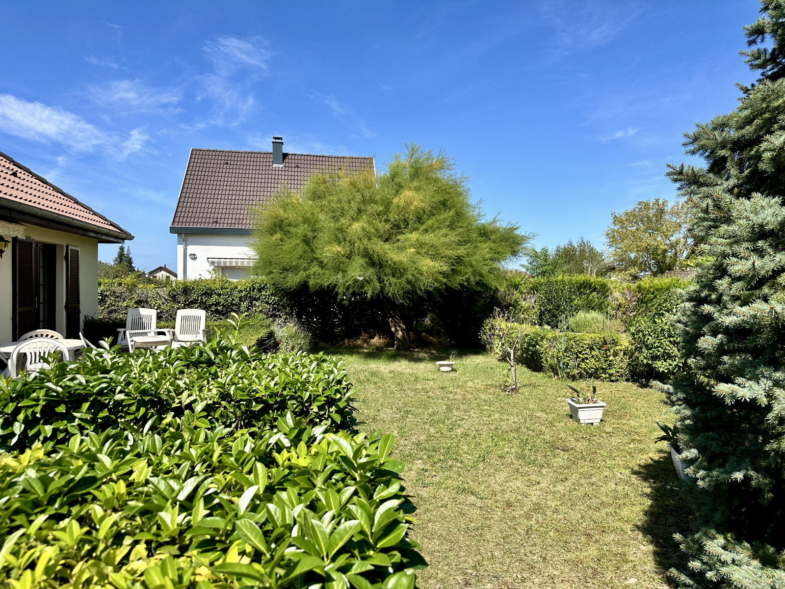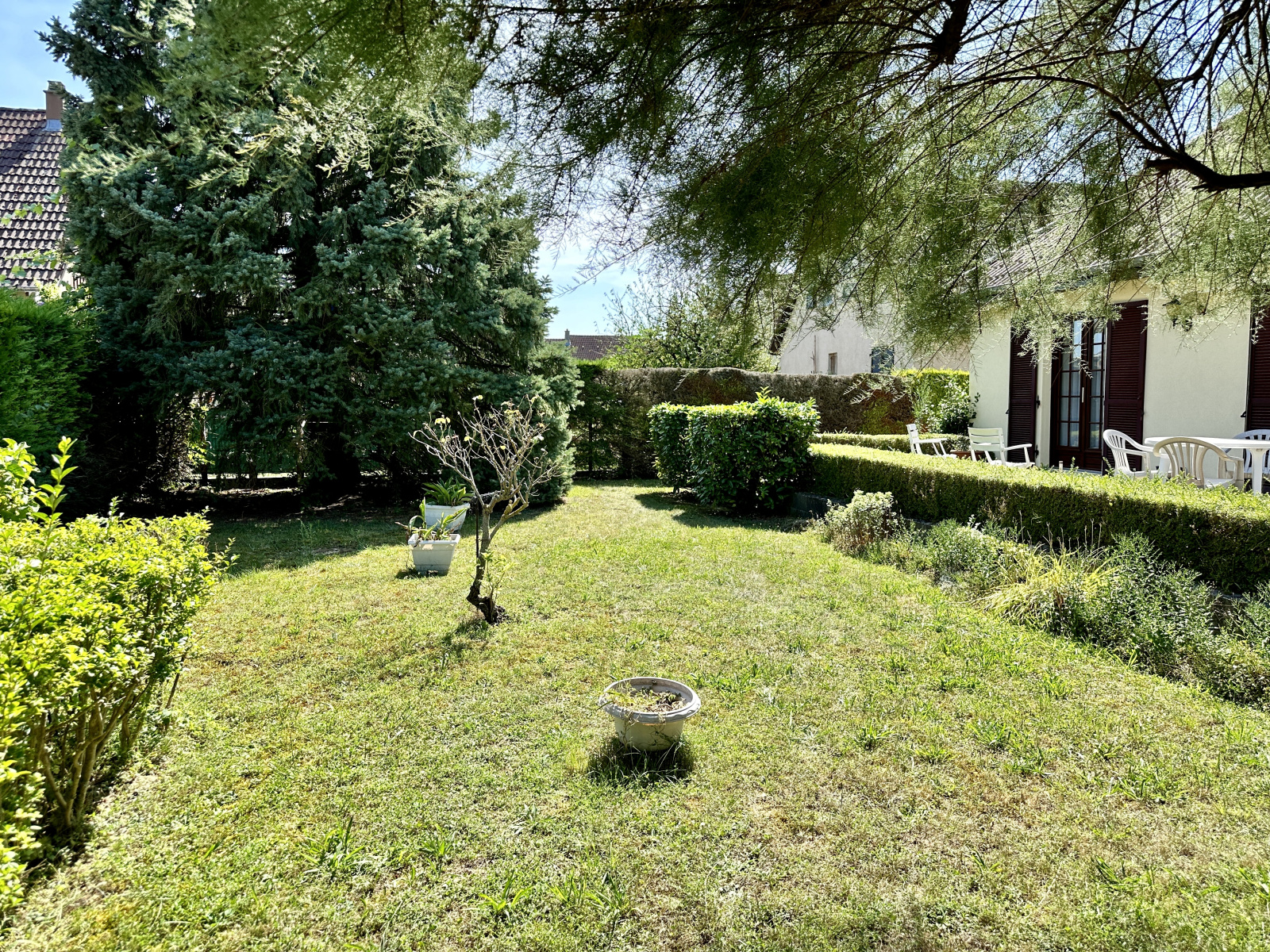 Une grande terrasse accessible depuis la cuisine et le séjour, jardin clos, l'ensemble sur 5.64 ares de terrain.