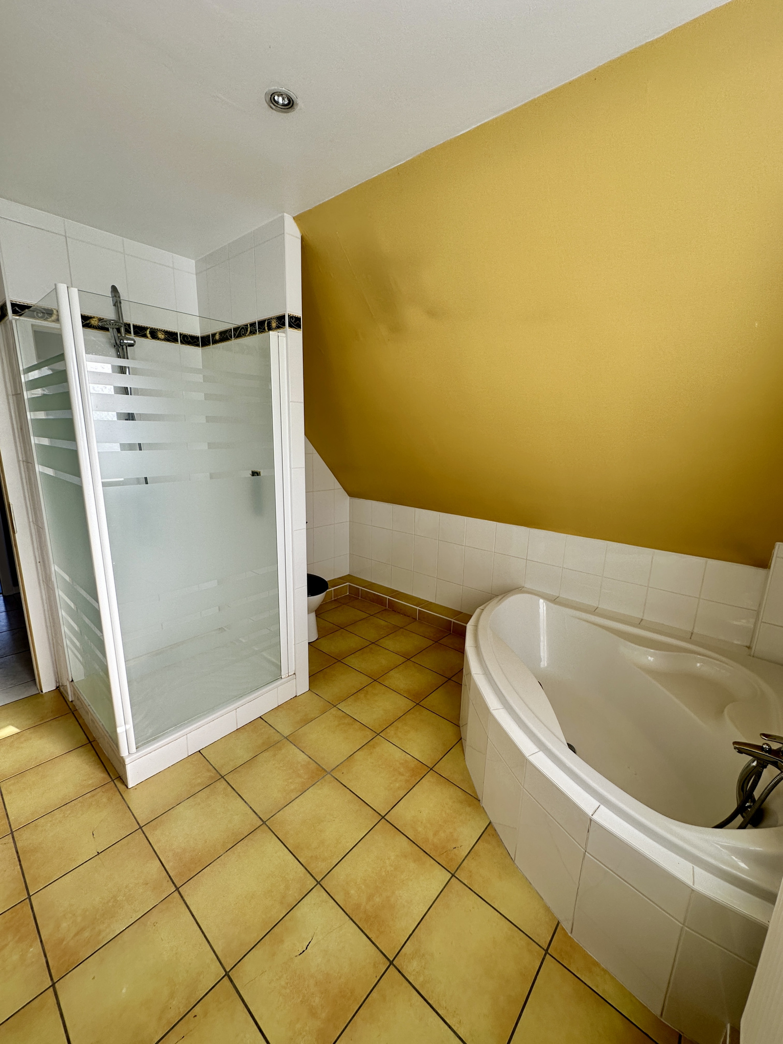 A l'étage 3 chambres de 14 ; 15 et 18 m², une salle de bains avec douche, baignoire et wc.