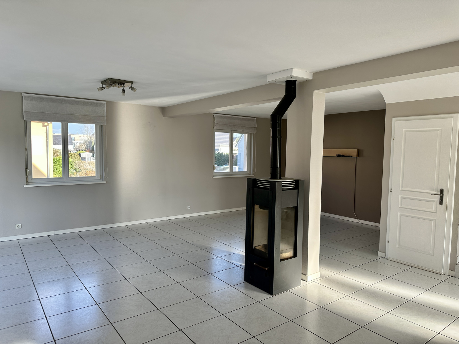 D'une surface d'environ 110 m² habitable et 122 m² sol, elle comprend un hall d'entrée avec placards, un WC séparé, une grande pièce de vie lumineuse équipée d'un poêle à bois, cuisine ouverte donnant accès sur la terrasse et le jardin.