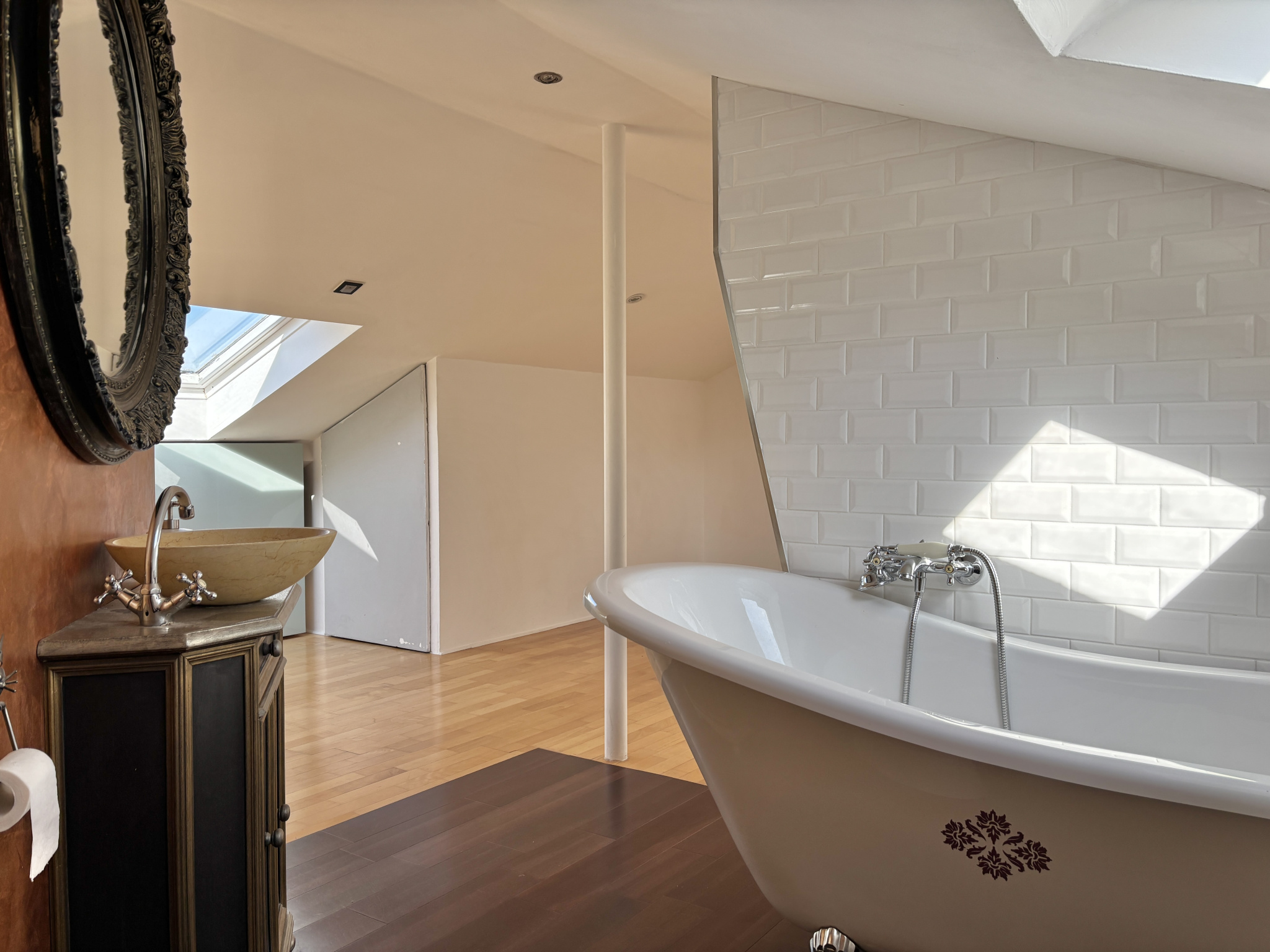 Appartement lumineux et traversant, beaux parquets massifs, chaudière gaz changée en 2018, porte blindée. Prévoir quelques travaux de rafraichissement et le remplacement de l'ensemble des Vélux.