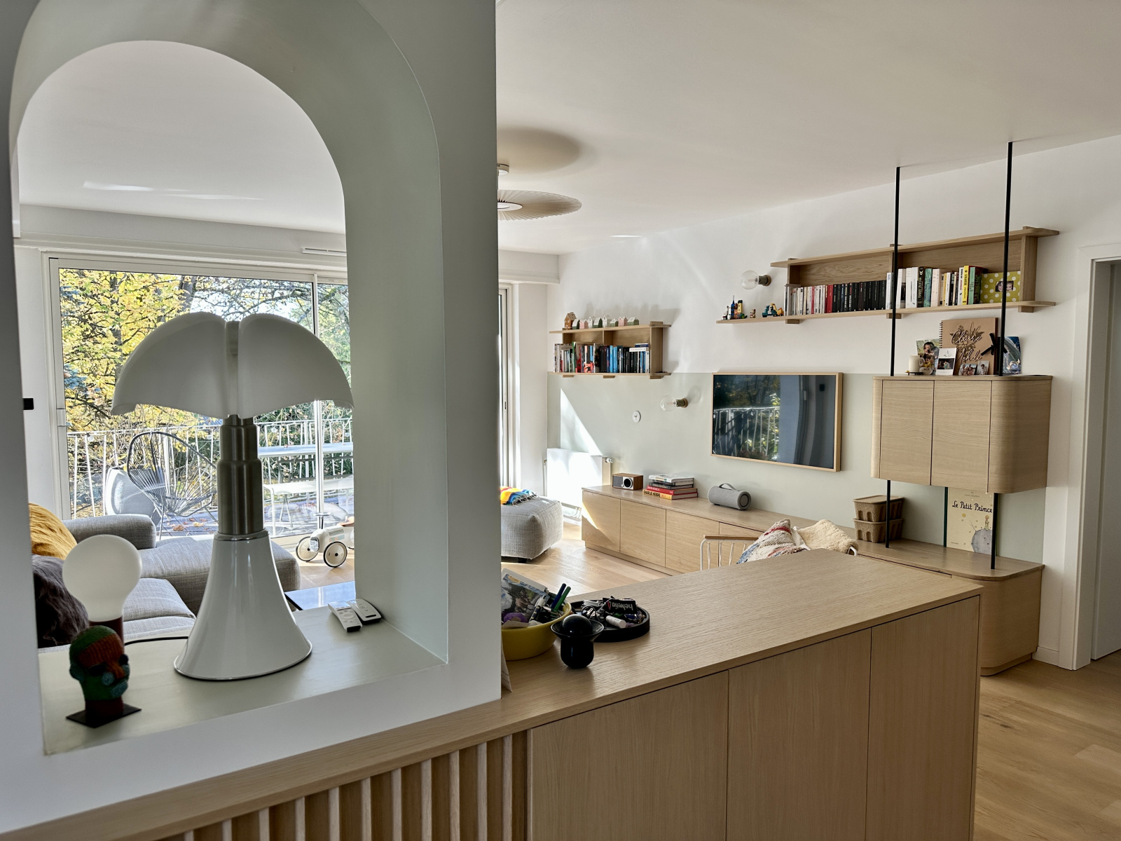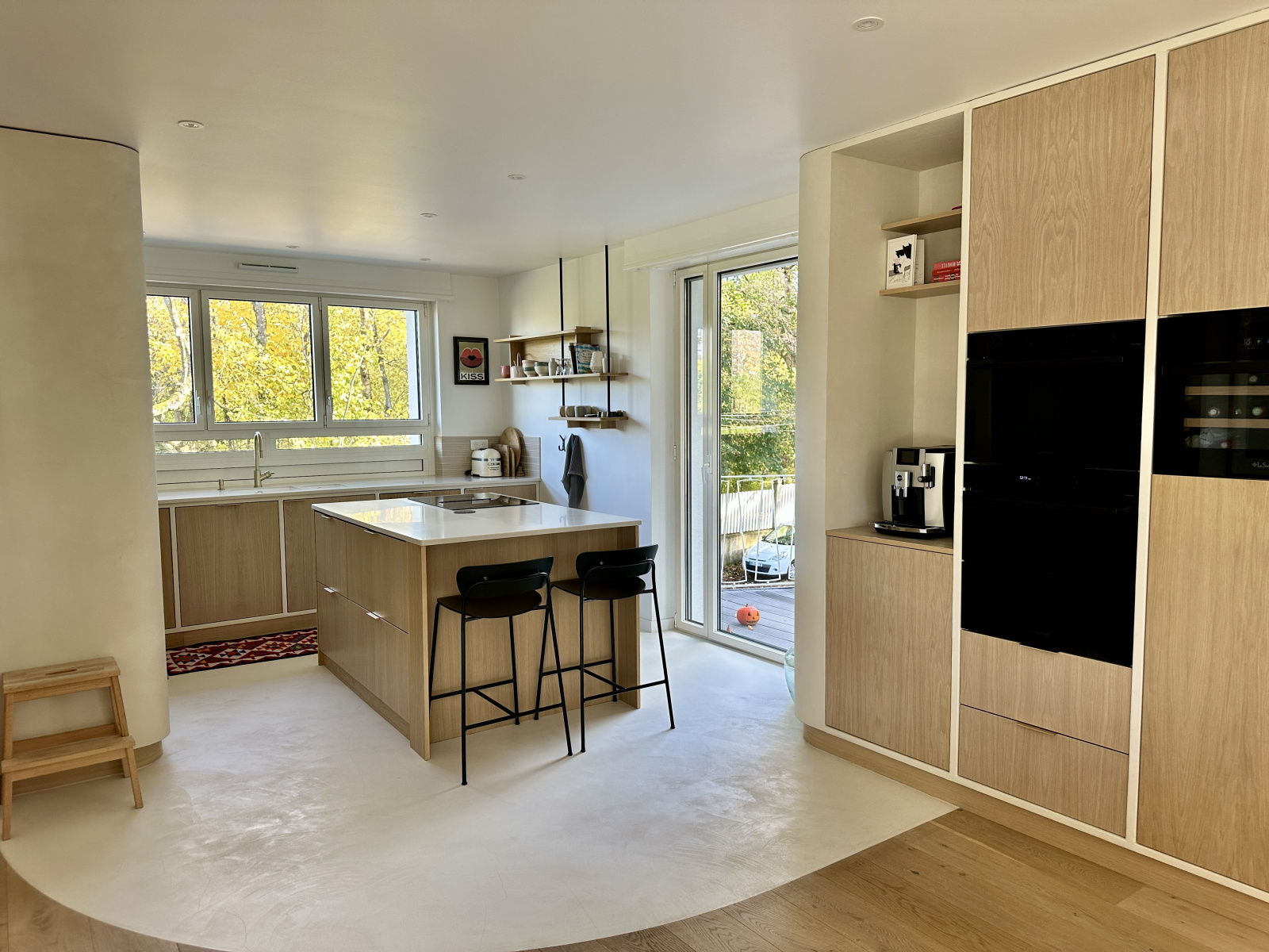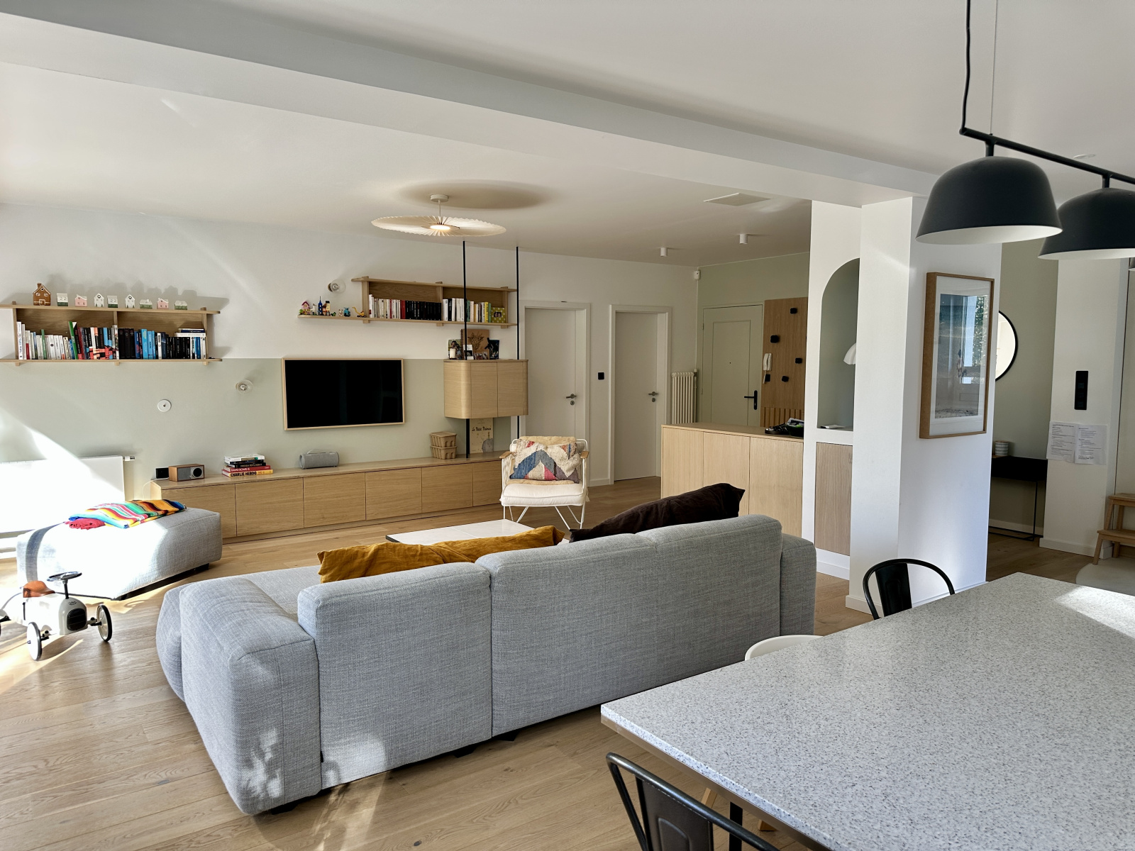L’entrée s’ouvre sur une vaste pièce de vie de 60 m² baignée de lumière, intégrant un salon, une salle à manger, ainsi qu’une cuisine haut de gamme conçue sur mesure par un menuisier. Une pièce attenante, modulable selon vos besoins, peut faire office de bureau ou de chambre d’amis.
